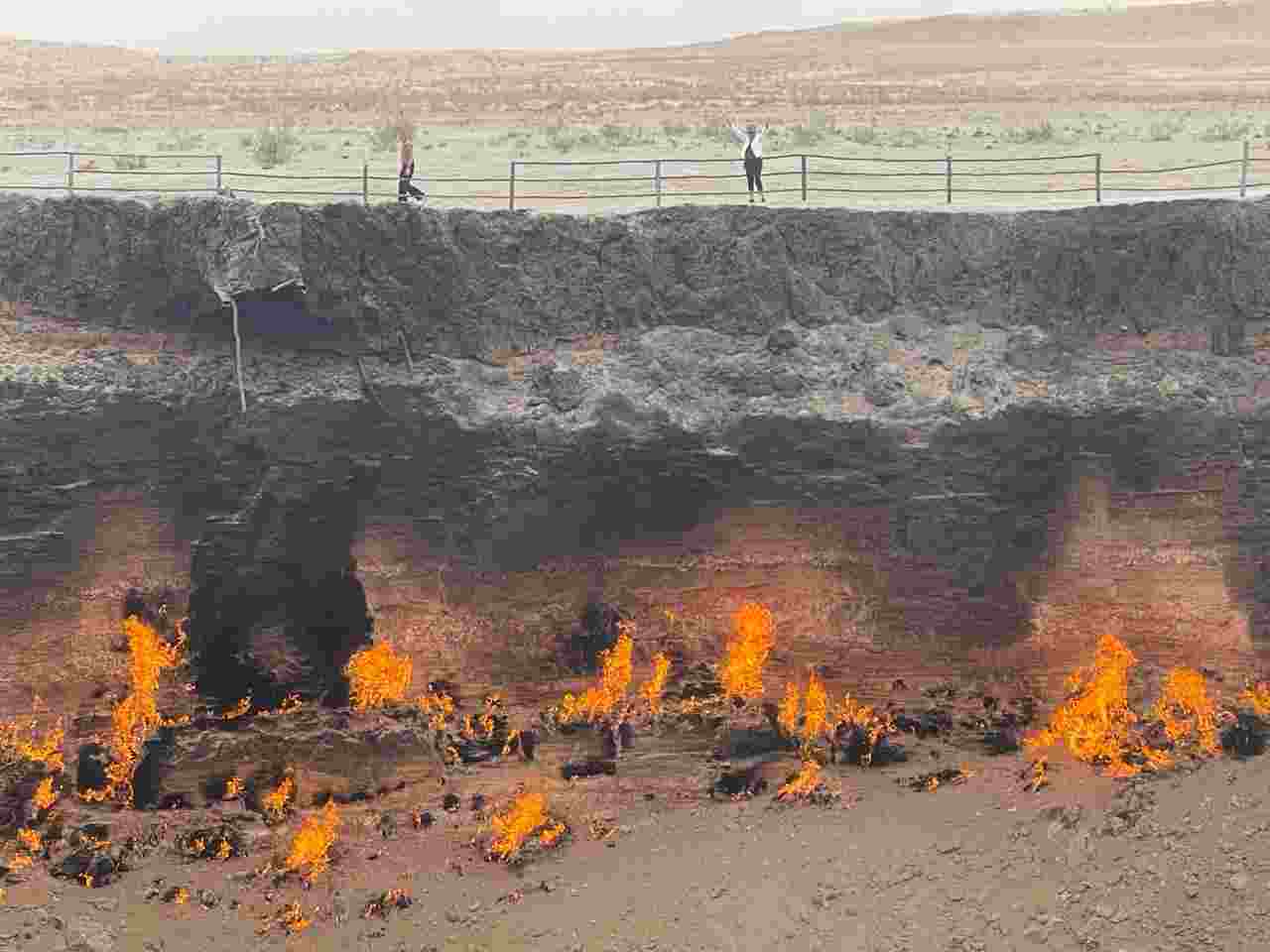 The Darvaza gas crater also known as the Door to Hell or Gates of Hell, officially the Shining of Karakum, is a burning natural gas field collapsed into a cavern near Darvaza, Turkmenistan. Hundreds of natural gas fires illuminate the floor and rim of the crater. The crater has been burning since 1971. You'll find the Darvaza mud crater perched almost conveniently close to the main highway - a mere 200-metre stroll away. The sheer cliffs of this crater proudly display layers of limestone deposits, with a diameter stretching 70 meters and a depth of around 20 metres. A further 24 km southward lies the Darvaza water crater. Much like its mud sibling, this crater is conveniently accessible from the main road – just 150 meters off the beaten track. It stretches 50 meters wide with steep walls leading to a water-filled basin 15 meters below ground level.