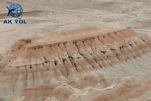 Transfer to Ashgabat airport for morning flight to Turkmenbashi at 06:20/07:20. Upon arrival transfer for Yangikala Canyons via Balkan Mountains - Impressive white, green and red limestone formations rise up from the desert sands. These cliffs are the remains of massive coastline and seabed of the pre-historical Parathetys Sea. This surreal landscape is impressive at any time of day, but sunset and sunrise offer particularly spectacular views. The area is reachable only by 4-wheel drive, passing through the Balkan Mountains and a vast highland area where camels, sheep and horses graze. BBQ style dinner & night is at the tent.
