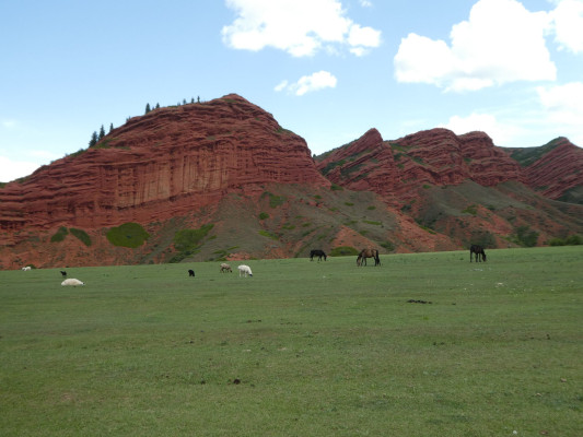 Transfer to Bokonbaeva village southern shore of Issyk-Kul Lake. On the way excursion to Jety-Oguz Gorge, see seven red stone mountains and Broken Hurt mountains. Walking to waterfall in the Kok-Jaiyk summer pasture which is surrounded by coniferous forests. Lunch-box. Continue excursion on the way and visit Skazka Gorge Dinner and accommodation in Family Guest House. Meals: full board