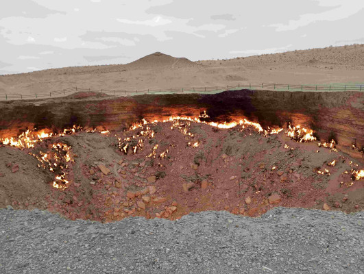 The Darvaza gas crater also known as the Door to Hell or Gates of Hell, officially the Shining of Karakum, is a burning natural gas field collapsed into a cavern near Darvaza, Turkmenistan. Hundreds of natural gas fires illuminate the floor and rim of the crater. The crater has been burning since 1971. Drilling punctured a natural-gas cavern, the cavern’s roof collapsed, and some sources state that engineers ignited the crater to prevent poisonous gases from spreading. The crater is near the village of Darvaza in the middle of the Karakum Desert.